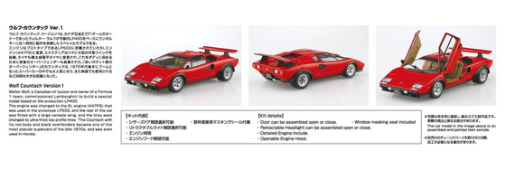 ウルフ・カウンタック バージョン1は、カナダ石油王でF1チームのオーナーであったウォルター・ウルフが市販のLP400をベースにランボルギーニ社へ特別に製作を依頼したスペシャルモデルである。エンジンはプロトタイプであるLP500に搭載されていた5Lエンジン(447PS)に変更、エクステリアはリアに大型の可変ウイングを装備、タイヤも極太超扁平タイヤに変更され、これをボディに収めるために前後のオーバーフェンダーも装備された。「赤いボディ+黒のオーバーフェンダー」のカウンタックは、1970年代後半にブームとなったスーパーカーの中でも大人気となり、また映画でも使用されるなど当時は大きな話題となった。